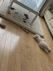そこには、こたつテーブルの下に散らばったおもちゃと、フローリングの床に寝転がる愛犬の姿がありました。